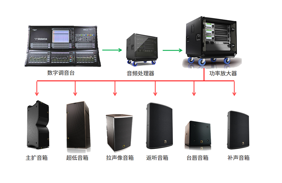 舞臺音響是給劇場觀眾提供演員聲音及演出音樂的傳聲設(shè)備,一個良好的音響系統(tǒng)能夠傳達(dá)出優(yōu)美的音樂和清晰的人聲。音響系統(tǒng)配合舞臺燈光,提供更加真實環(huán)境氛圍,能更加真實還原劇目所表達(dá)的場景。因此好的音響系統(tǒng)需要具備較高的還原性,感動性,專業(yè)人員使用起來有較高的便捷性和靈活性。系統(tǒng)構(gòu)架簡潔不繁瑣,利于操作人員搭建與維護(hù)。