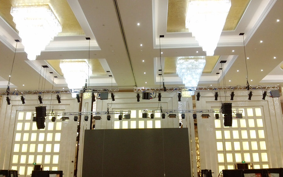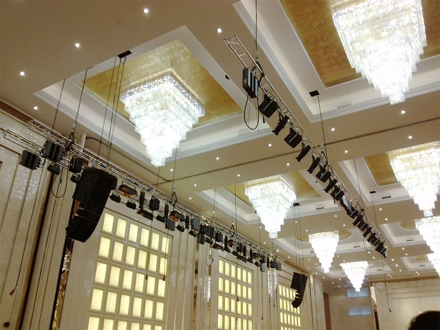 燈光系統(tǒng)方面配置了流動吊掛硅柜、聚光燈、成像燈、三基色會議燈、天幕燈等,可以完全滿足宴會廳和各類型會議、報告和小型演出活動需求。