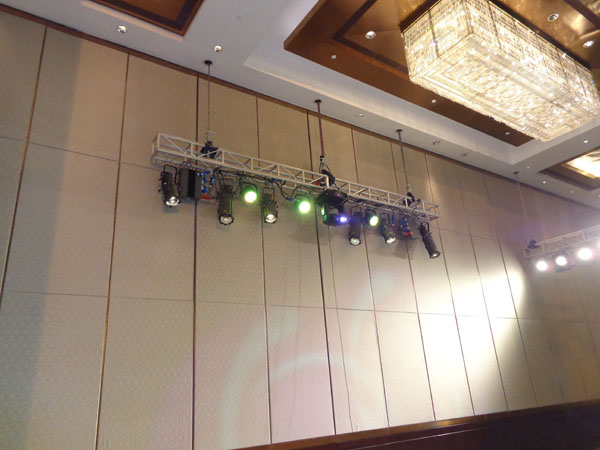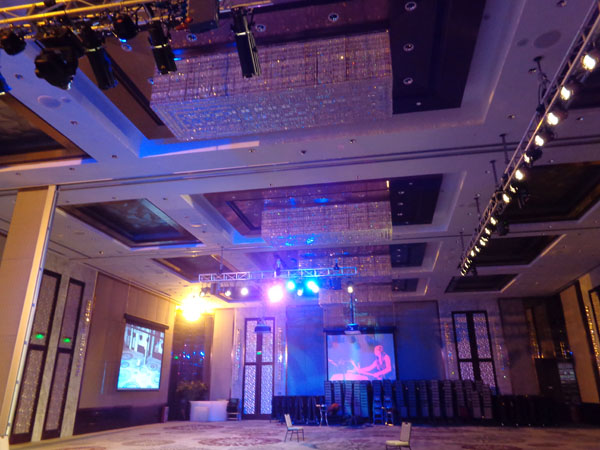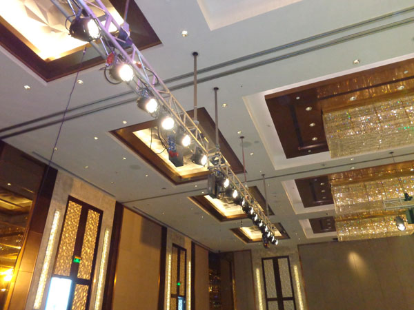 南京費(fèi)爾蒙酒店宴會(huì)廳設(shè)計(jì)了50多個(gè)升降吊點(diǎn)裝置,可以自由組合燈桿進(jìn)行升降,靈活變化舞臺(tái)區(qū)域,把宴會(huì)廳分割為多個(gè)區(qū)域均可以配置舞臺(tái)頂光吊桿和面光吊桿,功能十分齊全。